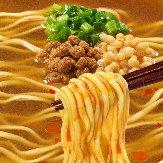 しっかりとした弾力と滑らかさを併せ持つ丸刃の太めんです。口の中で存在感をしっかりと感じられる、食べごたえ抜群のめんに仕上げました。