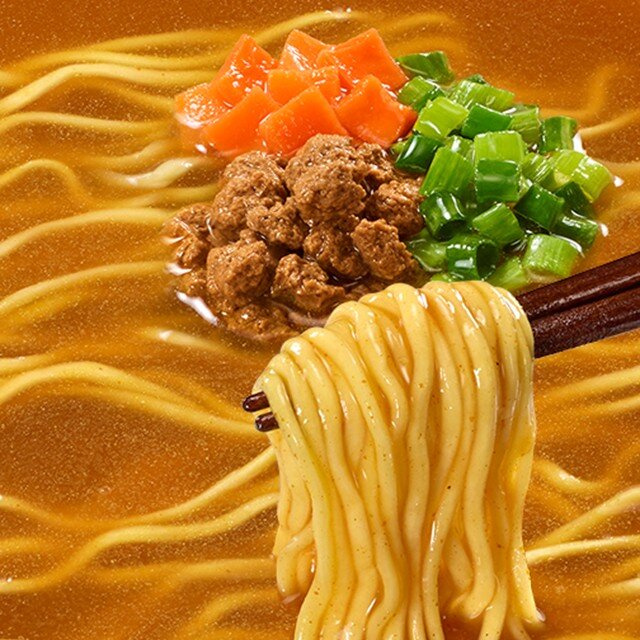 油揚げめん(小麦粉(国内製造)、植物油脂、食塩、しょうゆ)、スープ(糖類、食塩、カレー粉、ビーフ調味料、ポーク調味料、野菜調味料、チキン調味料、乳化油脂、トマトパウダー、香味調味料、カルダモンパウダー、酵母エキス、全卵粉)、かやく(鶏・豚味付肉そぼろ、人参、ねぎ)/加工でん粉、調味料(アミノ酸等)、炭酸Ca、増粘多糖類、酸味料、かんすい、カロチノイド色素、ベニコウジ色素、酸化防止剤(ビタミンE)、カラメル色素、甘味料(アドバンテーム、スクラロース、アセスルファムK)、香料、ビタミンB2、ビタミンB1、(一部に小麦・卵・乳成分・牛肉・ごま・大豆・鶏肉・豚肉を含む)